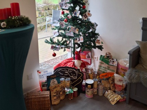 Mit Wunschkärtchen unserer Tierheimtiere ist im Foyer ein kleines Bäumchen geschmückt, und viele liebe Gaben sind schon angekommen.