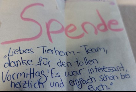 Als Dankeschön hatten die Gruppe für unser Tierheim gesammelt und übergab eine liebe Spende von 80 Euro: „Liebes Tierheim-Team, danke für den tollen Vormittag! Es war interessant, herzlich und einfach schön bei euch.“