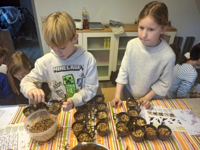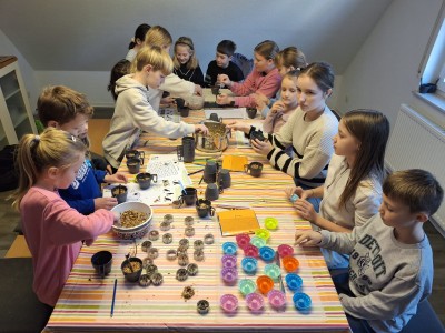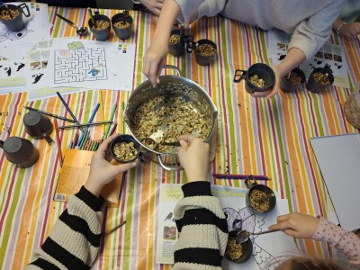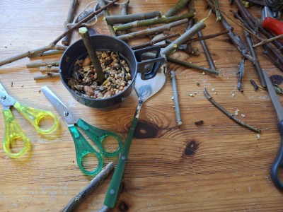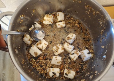 Die Kinder hatten großen Spaß daran, die Tassen und Gugelhupf-Formen mit der erhitzten Kokosfett-Futtermasse zu füllen. Zuvor wurde ein Stöckchen in die Tassen gesteckt, welches als Landeplatz dient.