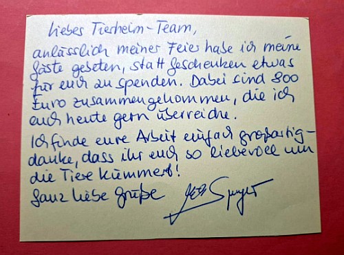 Bei der Übergabe war der Spende ein kleines Brieflein beigefügt, in dem unsere Tierschutzarbeit mit lieben Worten gewürdigt wurde. Über die großartige Unterstützung und Anerkennung haben wir uns riesig gefreut und bedanken uns ganz herzlich: Alles Gute kommt von oben!