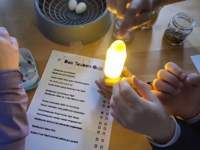 Zu Beginn des Treffens konnten die insgesamt 28 Kinder ihr Wissen in einem Taubenquiz testen und dabei lernen, dass das Futter für ein gesundes Taubenleben aus Sonnenblumenkernen, Weizen, Mais, Muschel-Grit und Hanf besteht und nicht, wie fälschlicherweise oft angenommen, aus Brot.