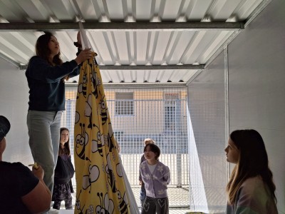 Um unseren Katzen eine weitere Spielmöglichkeit zu schenken, haben wir anschließend in einem der Katzenzimmer eine bunte Hängematte aufgehängt. Begeistert von diesem neuen Kuschelplatz, möchten wir auch die restlichen Vermittlungsräume mit solchen Hängematten verschönern.