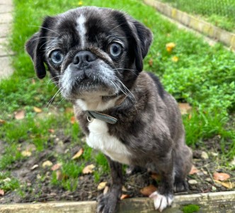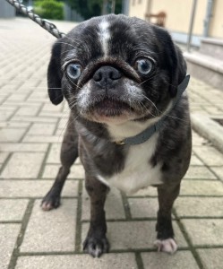 Die kleine Mops-Hündin Miley ist eine wahre Herzensbrecherin, sehr lieb, umgänglich und verschmust. Mit ihren blauen Augen weiß sie die Menschen zu verzaubern.